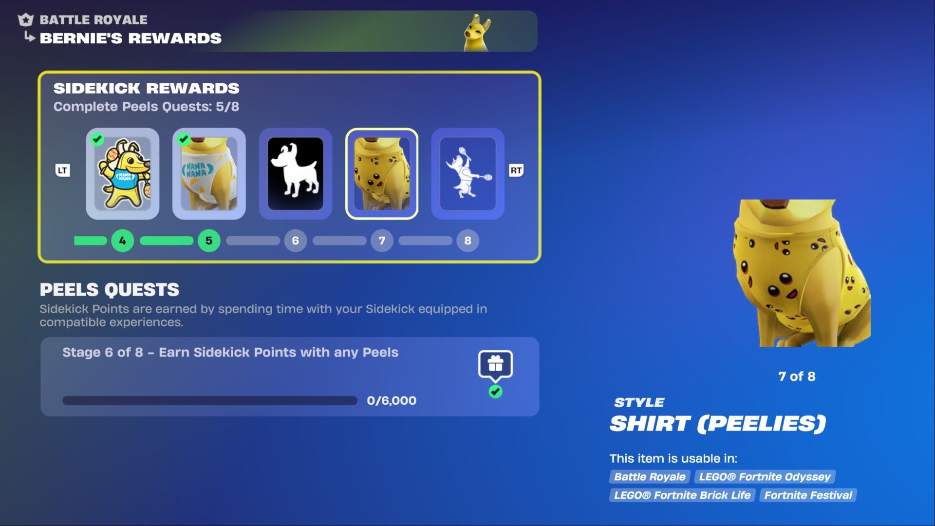 Peels был первым персонажем, представленным в качестве ‘помощника’ в Fortnite. Игроки, купившие Battle Pass The Simpsons, получили Peels мгновенно. Чтобы получить дополнительные стили и настройки для Peels, игрокам необходимо зарабатывать очки помощника, играя в Fortnite. Хотя будущие помощники могут быть разблокированы по-другому, в настоящее время заработок очков помощника с Peels — единственный способ разблокировать больше вариантов настройки для него.
