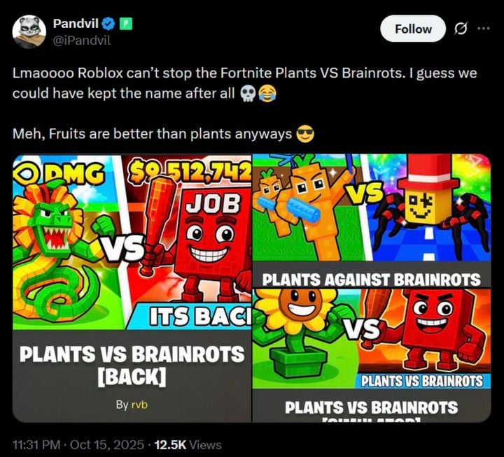 Итак, моя игра, Plants vs Brainrots, наконец-то вышла в Fortnite 15 октября, и, честно говоря, я не удержался, чтобы немного подколоть ситуацию с версией для Roblox. Просто показалось, что это подходящий момент, чтобы всё признать!